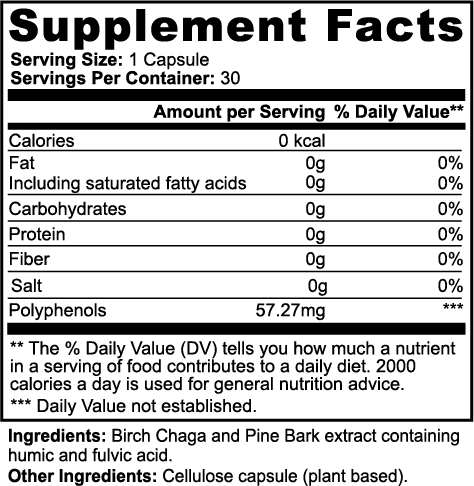 Ingredients: Birch Chaga and Pine Bark extract containing humic and fulvic acid, Cellulose Capsule (plant-based).