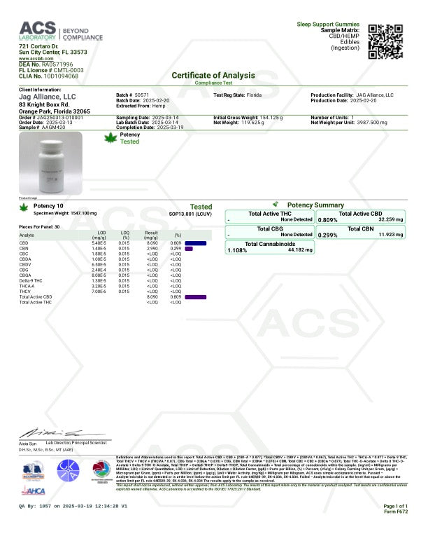 Ingredients: Hemp-Derived Cannabidiol (CBD), Cannabidol (CBN), L-Theanine, Passion Flower. Other Ingredients: Natural Syrup, Natural Sugar, Water, Pectin, Citric Acid, Sodium Citrate, Natural Flavors, Natural Colors, Coconut Oil, Carnauba Wax.