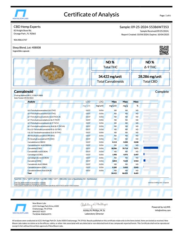 - Ingredients: Broad Spectrum Hemp Extract (CBD), Hemp-Derived Cannabinol (CBN), Melatonin. Other Ingredients: Fractionated Coconut Oil (MCT), Gelatin, Glycerin, Beeswax, Lecithin, Sorbitol and Purified Water.